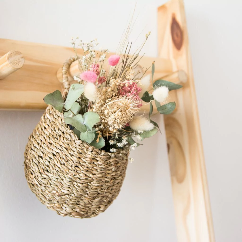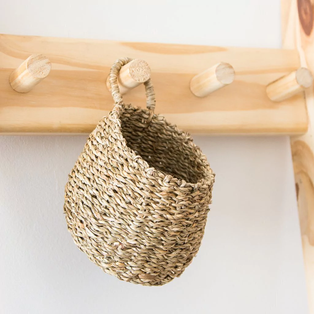 Mini cesto de fibras naturales con manija. Ideal para colgar sobre la pared o en perchero y darle un toque boho a tu entrada. Podes sumarle flores secas o llevarlo solo para dejar pertenencias como llaves, o incluso como portamaceta para una mini plantita. Lo vas a amar!