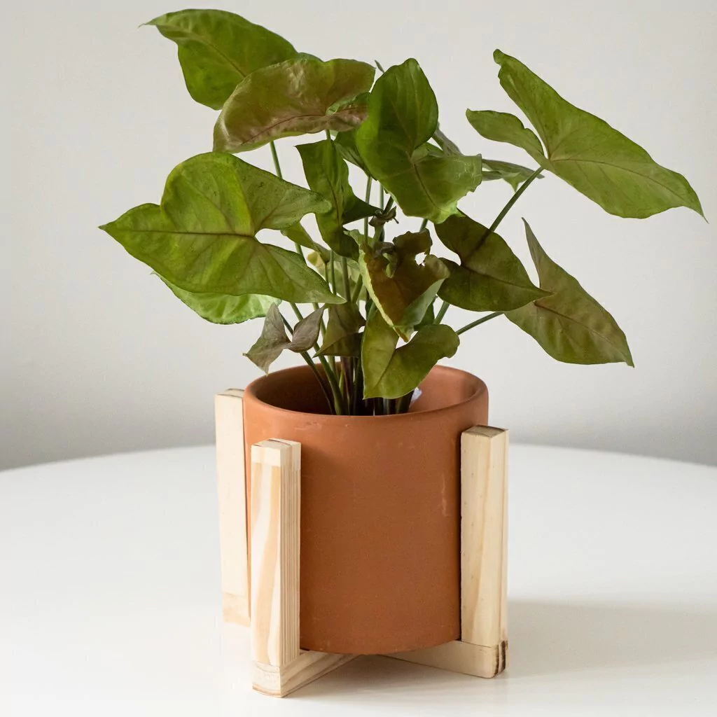 Maceta cilindrica de terracota, con pie de madera. Mide 15cm de diámetro, alto total 17cm. No incluye planta, en la foto usamos: Zingonio rosado.